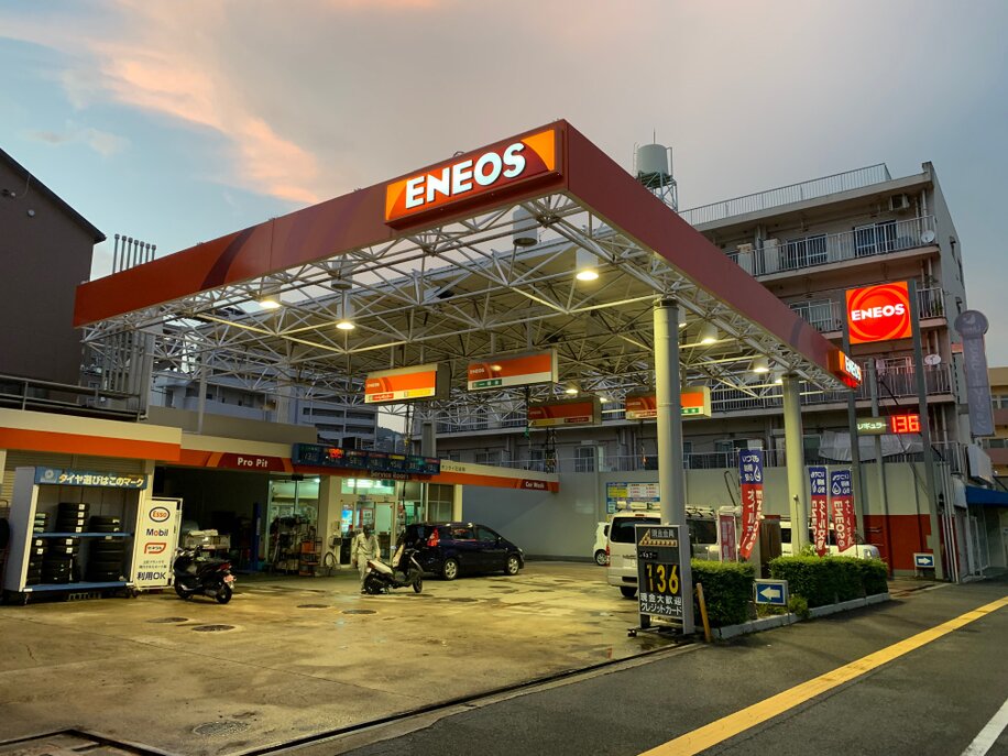ENEOSマークのガソリンスタンド サンタイ石油 中広SS