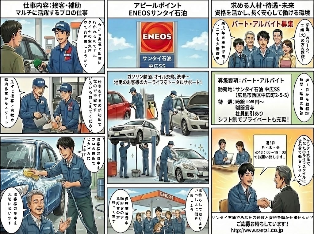 お客様への接客業務 (給油、オイル交換補助、洗車補助、タイヤ交換補助 愛車点検/報告補助など)