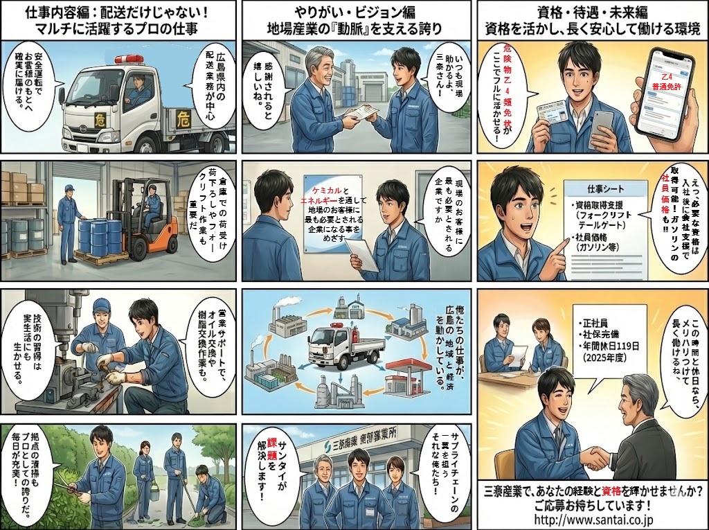 弊社は、広島に本社を置く石油化学品の商社です。取扱品目は、産業用燃料、溶剤、潤滑油、切削油、水処理薬品、樹脂原料などで、広島と福山に危険物、毒劇物の倉庫を保有しております。今回、広島県安芸郡坂町の拠点で危険物乙4類の免状を持っておられるトラックドライバー経験者様を募集致します。仕事内容は、倉庫における上記品目の荷受け、荷下ろしや、お取引先様への配送、オイル交換作業(弊社営業人員のサポート)、樹脂交換作業、関連会社(ガソリンスタンド)へのサポート、拠点の清掃(植木や草の刈込なお含む)、社内ミーティング(月1回)及び付帯の管理業務などです。